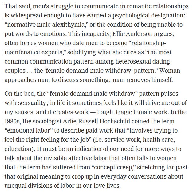 Other articles talk about the terrible nature of men. Just yesterday, I read this interesting piece in The New York Times about women who are fed up with dating men. To the point that the author coined a new term, “heterofatalism.” (source). Do check out the explicit positioning of men and women as if these are monolithic categories: